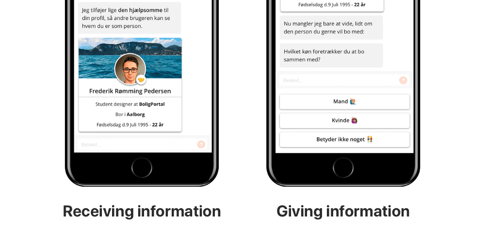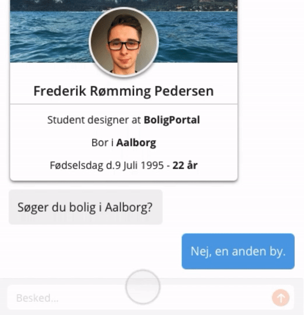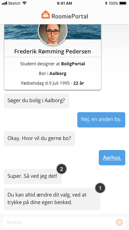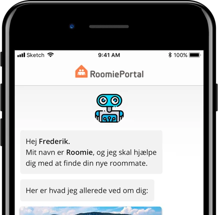 ‘‘You’re Frederik, and you want to find wants to find a roomie. You’re interested in finding a male roomie between 23–30 years of age, in the Aarhus area. You’re seeing yourself as a very helpful person, and think that common interests are important when finding your next roommate. You are interested in things like sport, politic, and boats.’’