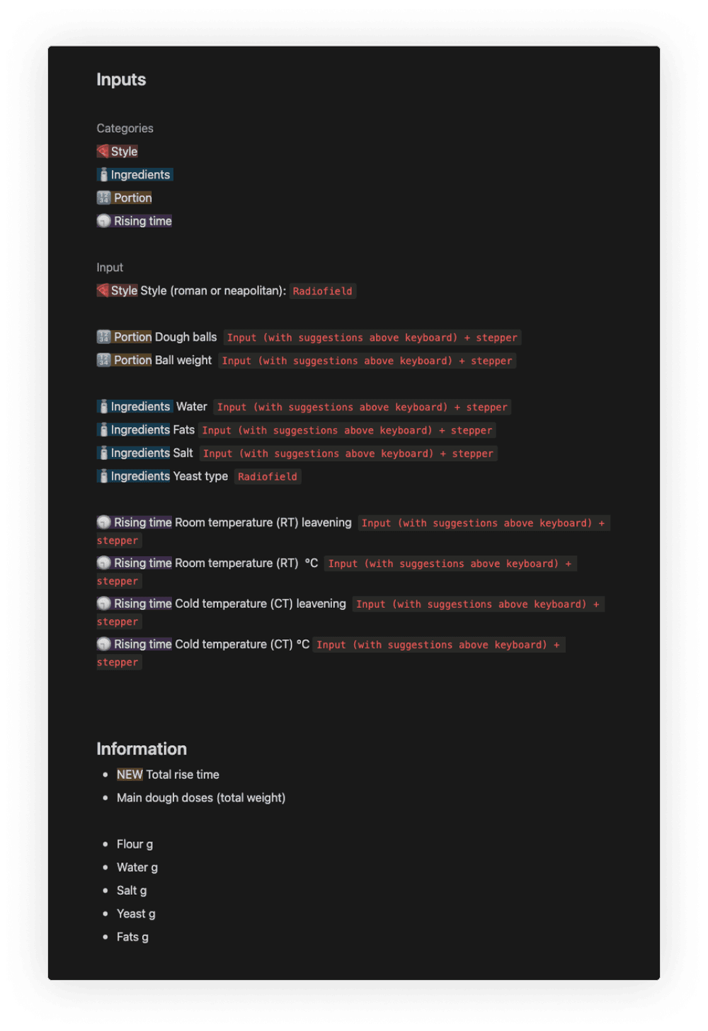 When configuring your pizza recipe there are some primary variables you have to input and some secondary variables. These could be spilled up by the following: